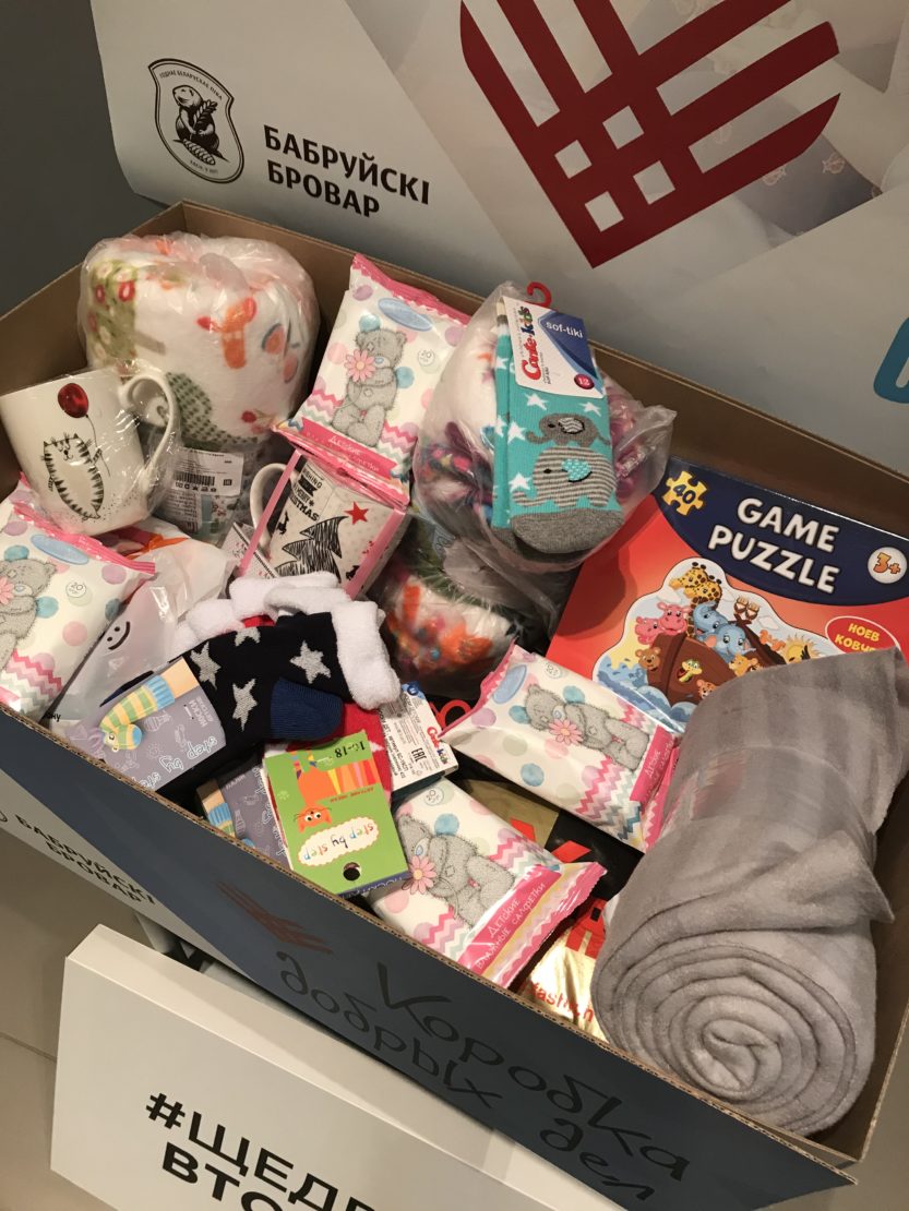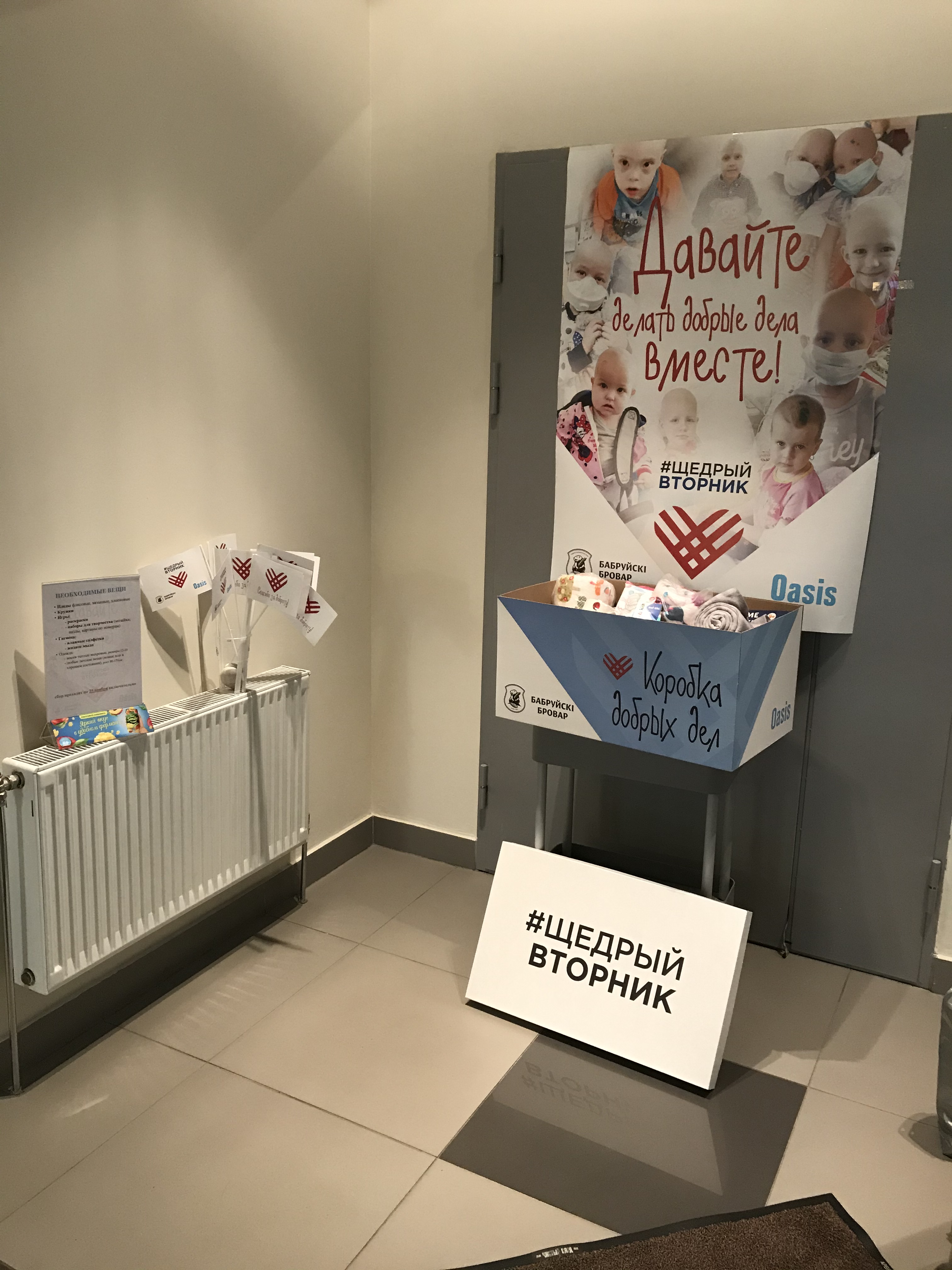 В минском офисе на проходных заводов Оазис групп и Бобруйский Бровар были оборудованы пункты приема пожертвований, где в течение всего ноября сотрудники могли оставить вещи для подопечных Детского онкологического центра в Боровлянях.